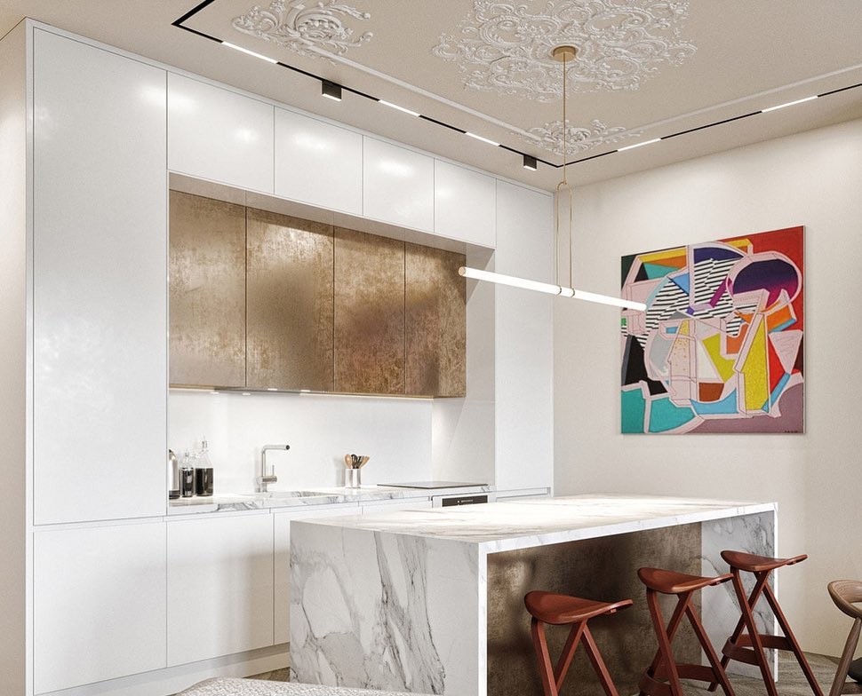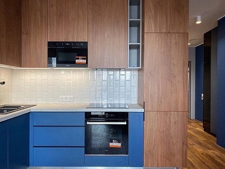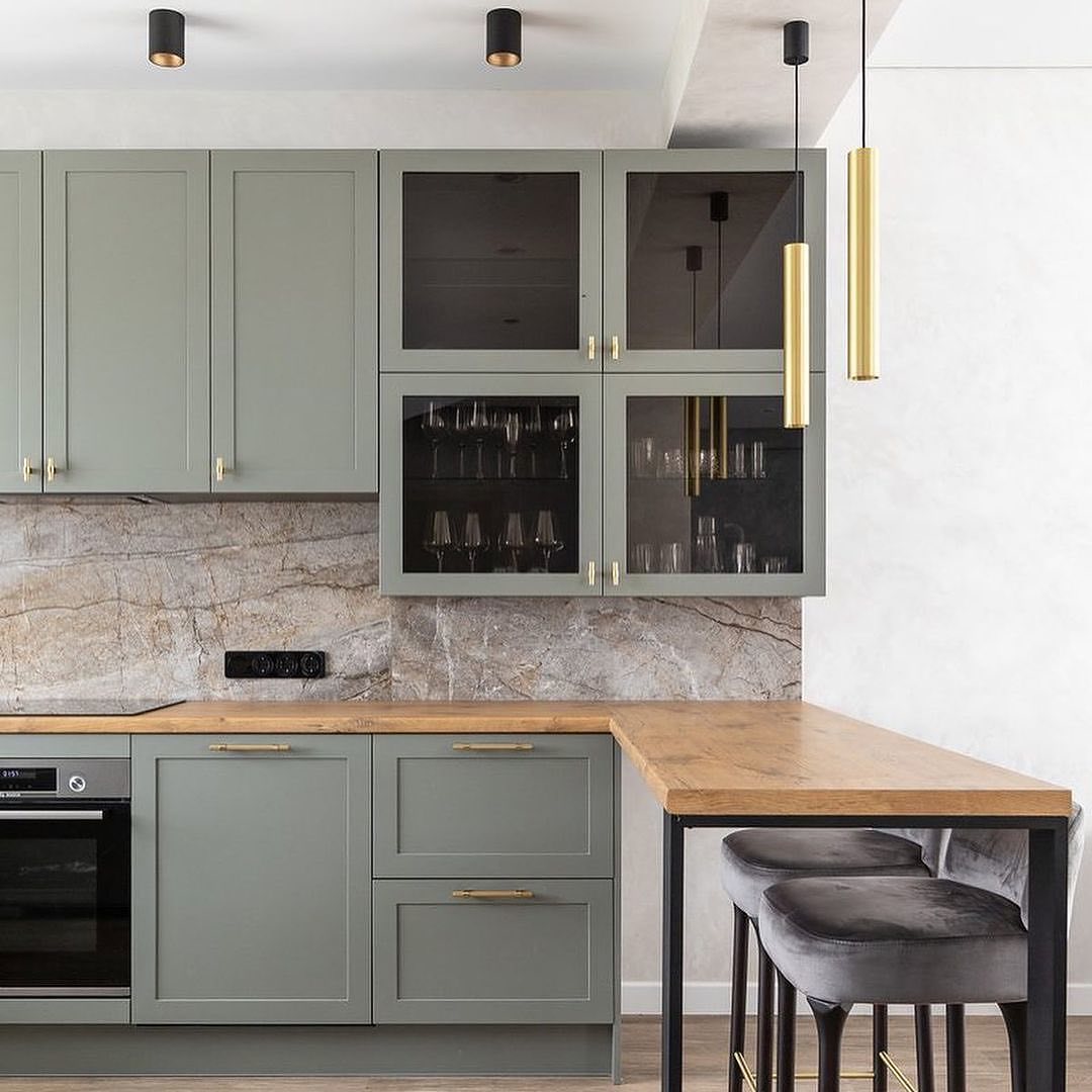 Кухня с фасадами из мдф эмаль + шпон натурального дерева, витриной из стеклянного фасада в алюминиевом профиле, вставками из латуни, лучшей фурнитурой BLUM (Австрия) и выдвижными механизмами VIBO (Италия), столешницей из акрилового камня или кварца.